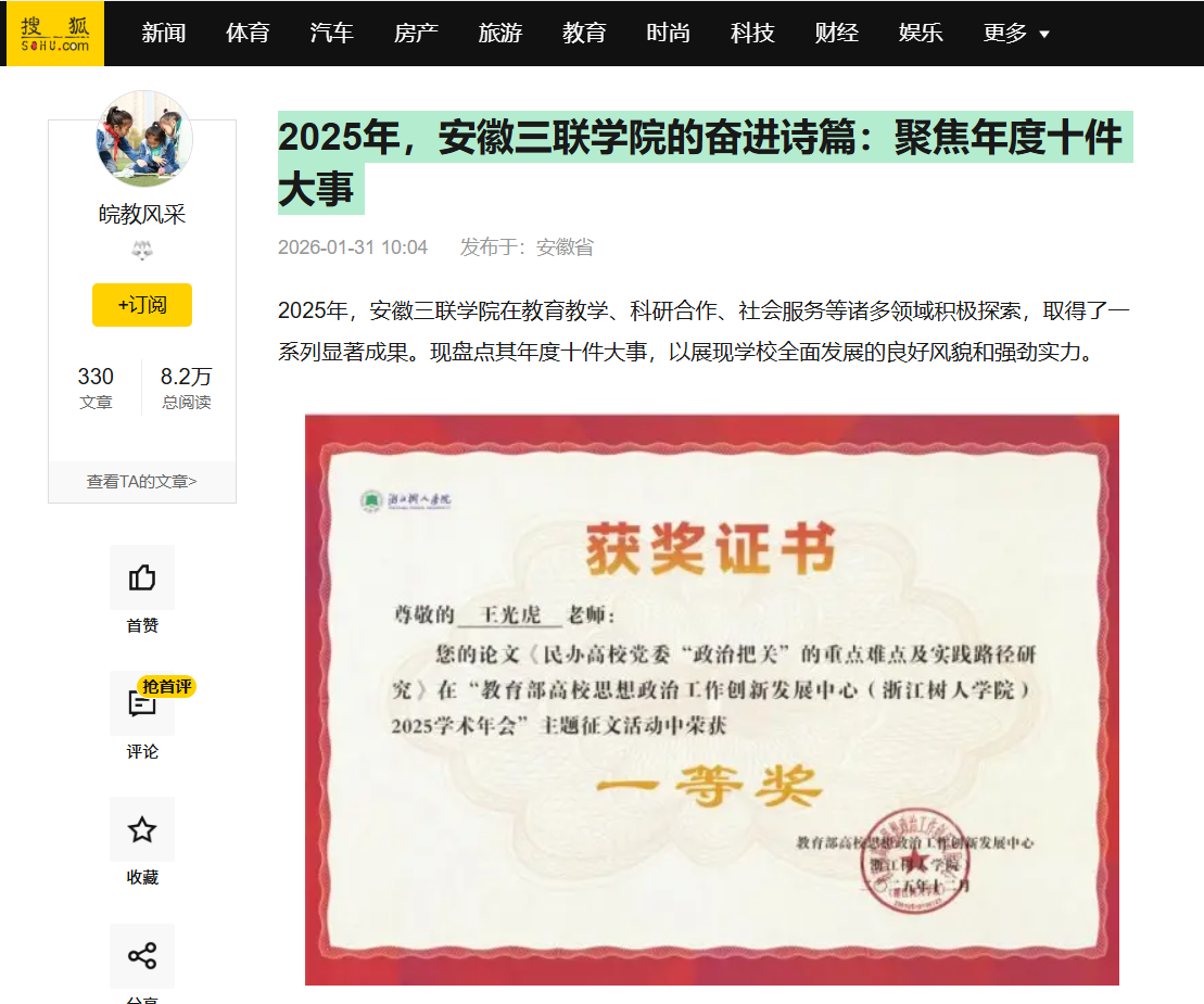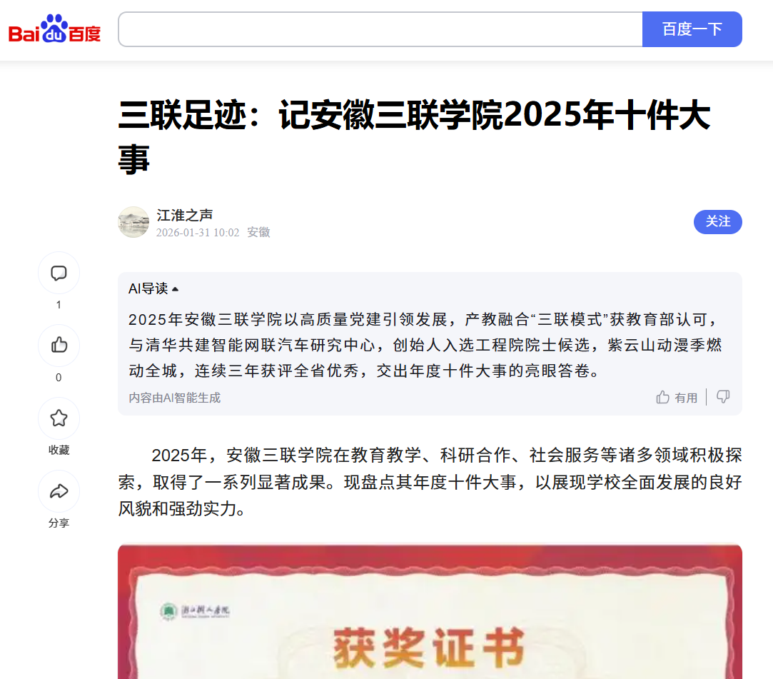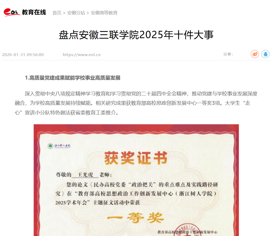 回望2025,安徽三联学院的发展画卷上,处处涌动着蓬勃的朝气与奋进的力量。这一年,是思想引领、党建精神深入人心的固本年;是学科竞赛捷报频传、艺体才华“硬核”出圈的丰收年;是产学研协同创新、迈向更广阔舞台的开拓年。让我们一起用“十件大事”重温那些定格2025的高光时刻。1.高质量党建成果赋能学校事业高质量发展深入学习贯彻中央八项规定精神和党的二十届四中全会精神,推动党建与学校事业发展深度融合,为学校高质量发展持续赋能。相关研究成果获教育部高校思政创新发展中心一等奖3项。大学生“走心”宣讲小分队特色做法获省委教育工委推介。2.上海(华理)三联康养研究院正式成立11月12日,学校与华东理工大学、安徽三联集团、中国老龄事业发展基金会联合共建的上海(华理)三联康养研究院,正式在上海市闵行区大零号湾成立。这是学校服务国家康养战略、履行社会责任、深化产教融合的重要实践,为全国养老服务领域提供了可复制、可推广的“三联范式”。3.学校与清华大学(车辆国重)共建三联智能网联汽车安全联合研究中心11月15日,清华大学智能绿色车辆与交通全国重点实验室(简称“车辆国重”)与安徽三联集团、安徽三联学院共建的“智能