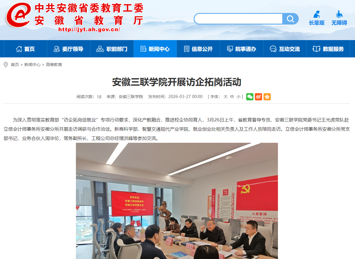 • 为深入贯彻落实教育部“访企拓岗促就业”专项行动要求,深化产教融合、推进校企协同育人,3月26日上午,省教育督导专员、安徽三联学院党委书记王光虎带队赴立信会计师事务所安徽分所开展走访调研与合作洽谈。新商科学部、智慧交通现代产业学院、就业创业处相关负责人及工作人员陪同走访。立信会计师事务所安徽分所党支部书记、业务合伙人周华伦,常务副所长、工程公司总经理洪峰等参加交流。
