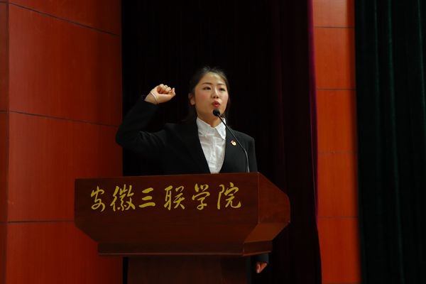 2019年新发展团员代表闻紫钰同学带领在场团员青年重温入团誓词,与会校领导、党委委员为2019年新发展团员佩戴团徽。