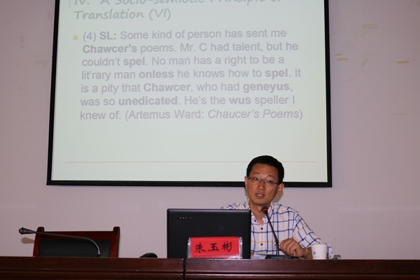 5月31日下午,安徽大学外语学院副院长朱玉彬教授应邀来我校讲学,在B01报告厅做了主题为“翻译中的语义学”的学术讲座。讲座由外语学院科研副院长赵衢主持,外语学院师生代表共170余人聆听讲座。