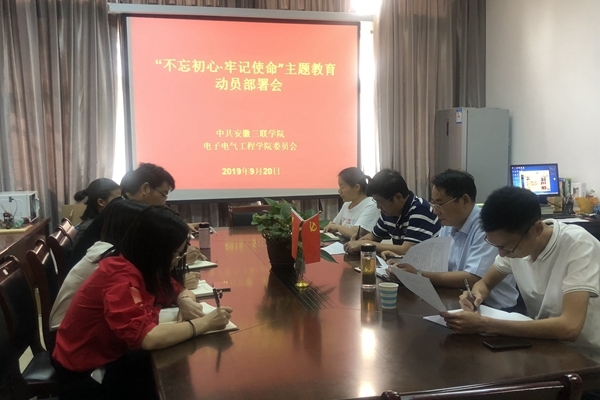 为深入贯彻落实学习习近平新时代中国特色社会主义思想和总书记在学校思想政治理论课教师座谈会上的重要讲话精神,进一步推进基层党委“不忘初心、牢记使命”主题教育深入开展,9月20日中午,电子电气工程学院党委在E107会议室组织举办“不忘初心、牢记使命”主题教育动员部署会,校党委副书记鲁先长、校“不忘初心 牢记使命”主题教育指导一组成员张启元、电子电气工程学院党委委员、副处级以上领导干部和支部书记出席本次会议,会议由电子电气工程学院党委书记赵利侠主持。