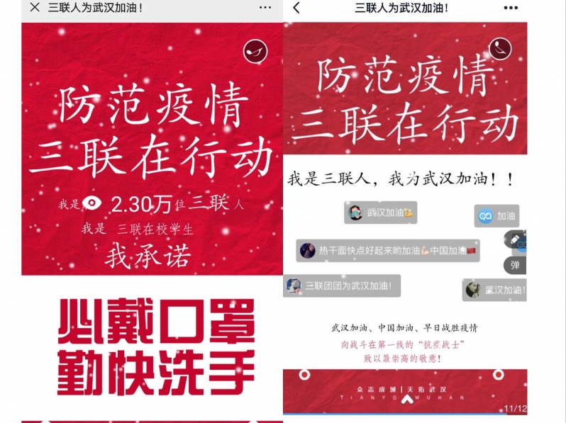 仅仅5天时间,在全校10个二级学院团总支的不懈努力下,校团委共收到文创作品247份,其中包括海报作品《黎明的那道光》、《逆行者》等128份,短视频作品《冬已至,春可期》、《终结者》等63份,书画作品《万众一心 决不后退》、《荆楚大疫》等56份;新媒体中心制作原创 H5“三联人为武汉加油”微信接力,共有 2.3 万师生及校友接力,以表明坚决打赢疫情防控救治这场硬仗的决心。