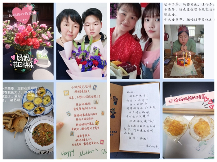 同学们以各种方式表达对母亲温馨而真切的祝福和浓浓的爱意,通过绘画、照片、剪贴等形式自己动手制作祝福卡片,拍摄母亲最美瞬间,给母亲写一封信,发祝福红包,拥抱一下母亲,陪母亲聊聊天,给母亲做顿饭、泡杯茶,为母亲捶捶腿、揉揉肩,给母亲打问候电话……