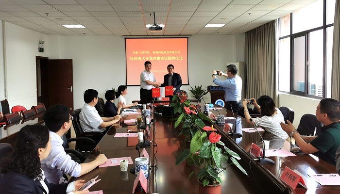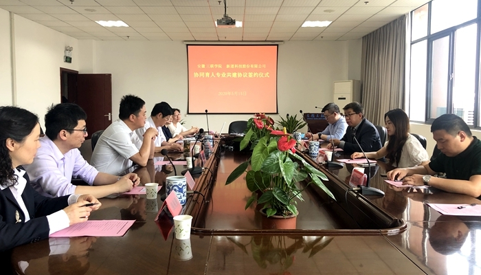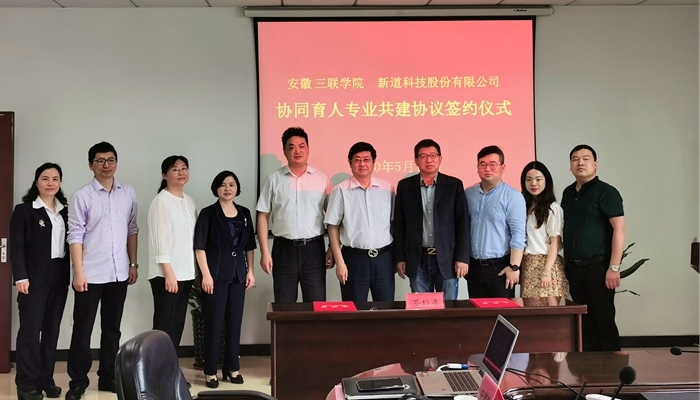 仪式伊始,鲁先长代表学校对来宾表示热烈欢迎;执行院长宋梦岚就安徽三联学院与新道科技产教融合协同育人合作协议书做简单介绍;最后,姜发根副校长、刘曙光副总裁分别代表校企双方在产教融合协同育人合作协议上签字,并合影留念。