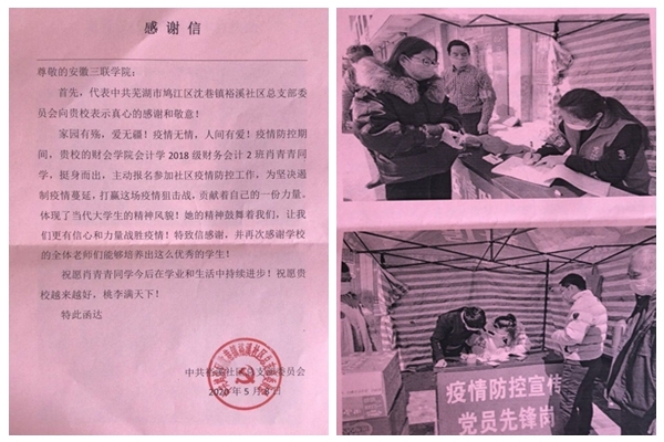 近日,中共芜湖市鸠江区沈巷镇裕溪社区总支部委员会向我校发来感谢信,赞扬了我校财会学院2018级财务会计2班肖青青同学在新冠病毒疫情防控期间积极投身疫情抗击志愿服务工作。