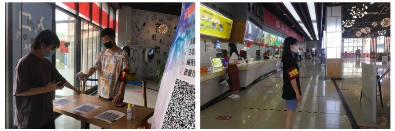 近日,财会学院组织青年志愿者成立了疫情防控文明督导小组,小组成员分别驻守在食堂各楼层入口,为用餐同学检测体温,引导同学们保持间距,按照指定图标有序排队出入,并维护食堂现场秩序,保证单人单桌同一方向就餐,互不交谈,不在食堂多逗留;同时温馨提示同学们自觉将餐盘送至收餐处。