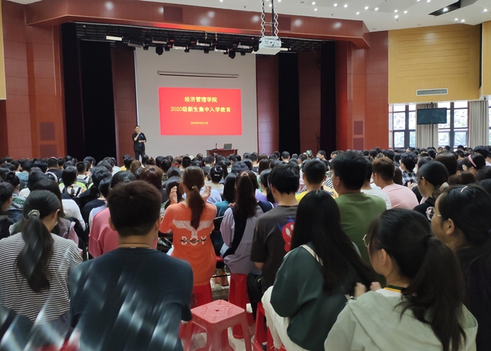 为了让2020级新生更好适应大学生活和了解大学学习的特点,尽快转变角色融入新的环境,经济管理学院扎实开展新生入学教育,9月23日,入学教育集中宣讲会在图书馆多功能厅举办,2020级全体新生参加,宣讲会由执行院长占海文主持。