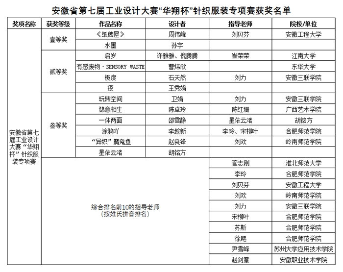 安徽省第七届工业设计大赛“华翔杯”针织服装专项赛是经安徽省经济和信息化厅批准,由上海华翔羊毛衫有限公司全资子公司阜南华翔羊毛衫有限公司主办、安徽宜飞思工业设计有限公司承办的针织服装设计比赛。 评审标准坚持以设计服务产业为基础,并兼顾鼓励设计师的创新。作为一项全国性赛事,大赛以促进培养高校学生的实践能力、创新精神和团队意识为目标,引领工业设计教育发展趋势,设计作品可直接转变为市场方产品,在以赛促教、产业融合等方面发挥了积极作用。