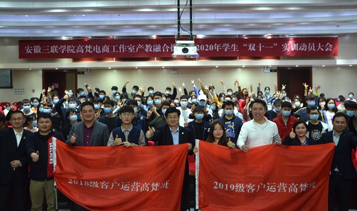 为献礼三联集团30华诞 ,推动产教深度融合,10月29日,我校在图书馆学术报告厅举行了高梵电商工作室产教融合推进暨2020年学生“双十一”实训动员大会。安徽高梵电子商务有限公司副总裁稽文容,安徽饭饭网络服务有限公司总经理徐许、副总经理张传耀,校党委副书记、副校长鲁先长,副校长姜发根,实践教学部部长王力等出席大会,经济管理学院全体管理人员、电子商务专业负责人,教师、辅导员代表,2018、2019级电商高梵班学生等参加大会。大会由副校长蔡文芬主持。