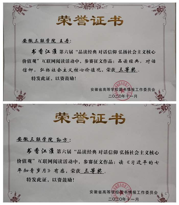 11月20日,由安徽省高等学校图书工作委员会主办的第六届书香江淮“品读经典对话信仰弘扬社会主义核心价值观”互联网阅读活动颁奖暨第七届活动启动仪式在梅山饭店举行。此次活动共收到全省征文作品11319篇,经专家评审,评审出征文获奖者70名,其中我校学生的两篇征文获比赛三等奖。