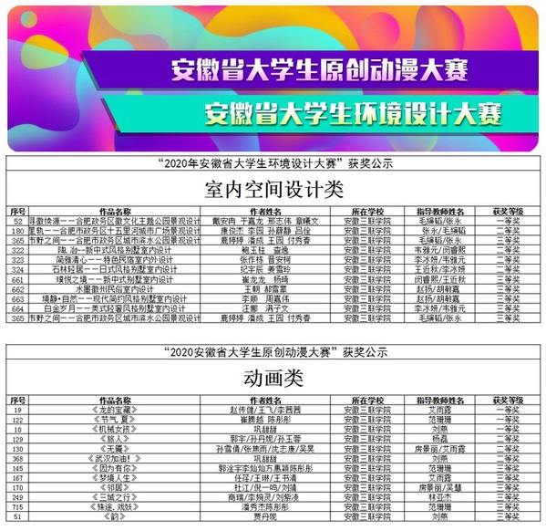 日前,由安徽省教育厅主办的“2020年安徽省大学生原创动漫设计大赛”和“2020年环境设计大赛”两项省级赛事获奖名单在组委会网站公示,我校动漫与数字艺术学院的参赛作品获一等奖4项,二等奖7项、三等奖11项。