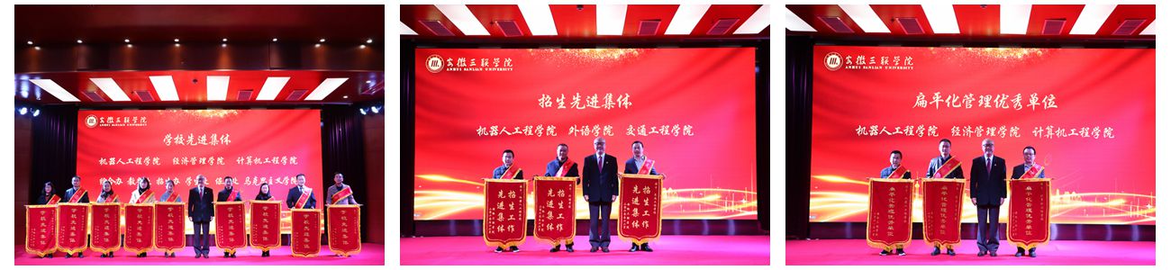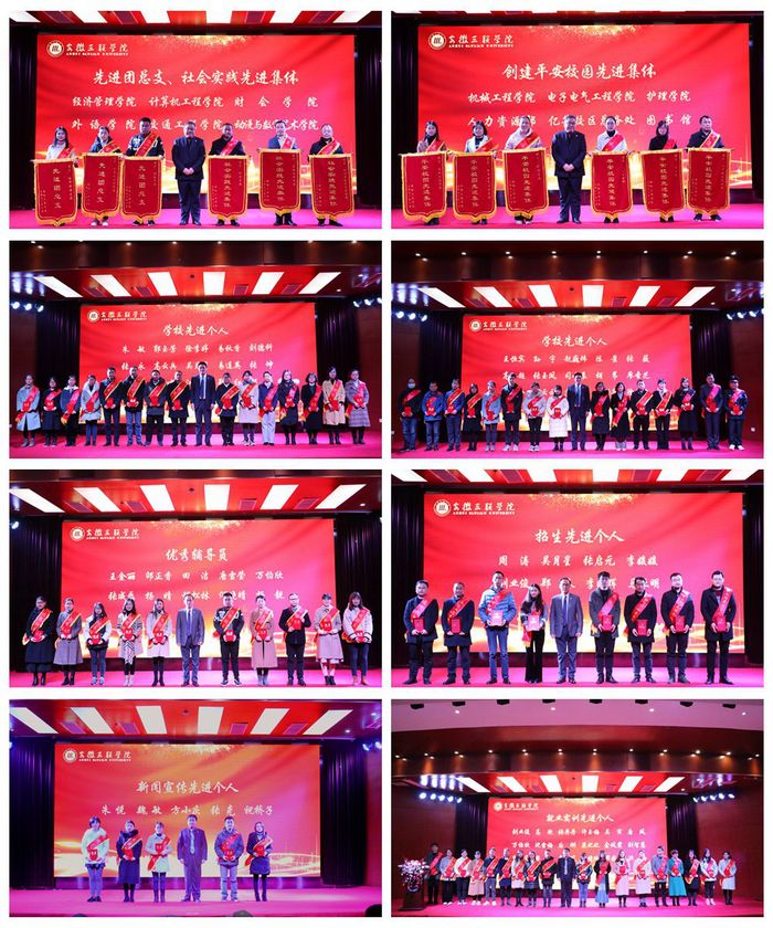大会在庄严的国歌和校歌声中拉开序幕。副校长江秀丽、蔡文芬、操晓峰、金哲分别宣读表彰文件。大会共表彰2020年度学校先进集体9个、先进个人61名;扁平化管理优秀单位3个;招生工作先进集体3个、先进个人8名;就业工作先进集体4个、先进个人19名;创建“平安校园”先进集体6个、先进个人15名;新闻宣传工作先进集体3个、先进个人5名;先进团总支3个,社会实践工作先进集体3个,社会实践“优秀指导教师”9人;优秀辅导员10名。金会庆校长、李明阳书记及副校长姜发根、张世伟、秦永元分别向受表彰单位和个人颁发锦旗和荣誉证书。