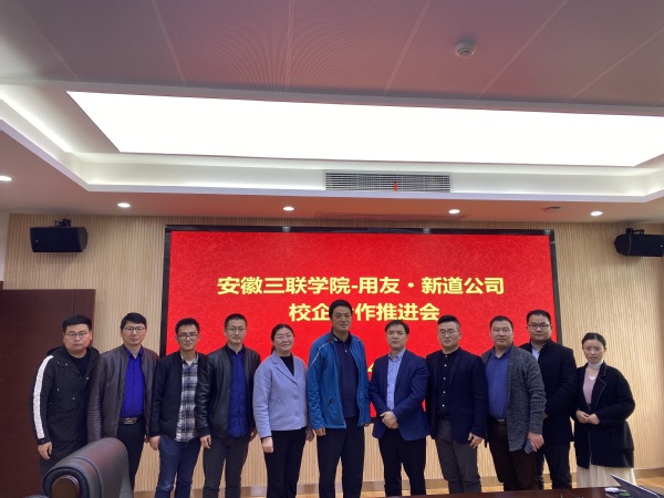 为深化校企合作,提升人才培养质量,推动产教融合工作向纵深发展, 4月1日上午,安徽三联学院-用友新道公司校企合作推进会在T412会议室召开。副校长姜发根、实践教学部部长王力,财会学院、经济管理学院相关领导;新道科技股份有限公司服务事业部总经理何胜利、安徽省区总经理吕京波等参加会议。