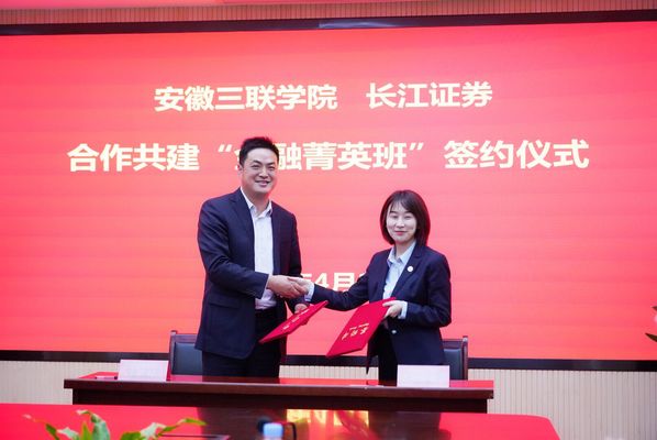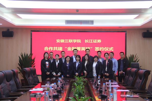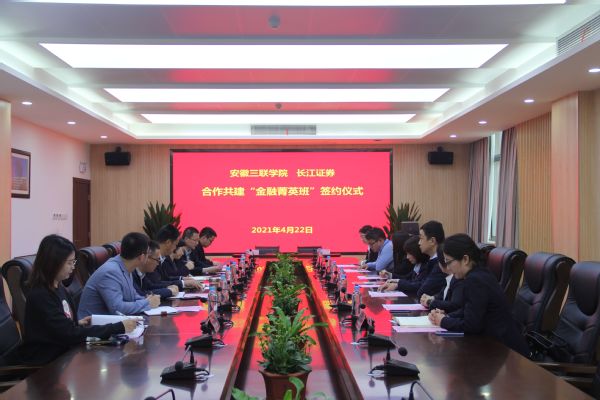 为深化校企合作,不断探索产教融合育人模式,4月22日,安徽三联学院与长江证券合作共建“金融菁英班”签约仪式在图书馆412会议室举行。长江证券合肥长江西路证券营业部总经理马沁、阜阳证券营业部总经理于进洋、宿州证券营业部副总经理李静雯,合肥长江西路证券营业部营销总监王晨、营销主管李光靖,以及安徽三联学院副校长姜发根、蔡文芬出席签约仪式,学校实践教学部、经济管理学院等相关人员参加仪式,签约仪式由经济管理学院执行院长占海文主持。