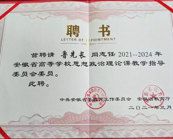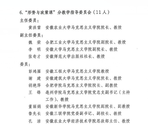 为全面贯彻学校思想政治理论课教师座谈会精神,推动用习近平新时代中国特色社会主义思想铸魂育人,深化教育教学改革创新,进一步提高人才培养质量和水平。近日,中共安徽省委教育工委、安徽省教育厅公布了新一届高等学校思想政治理论课教学指导委员会名单(皖教工委函[2021]92号),我校党委副书记、副校长鲁先长教授入选,担任“形势与政策课”分教学指导委员会委员。
