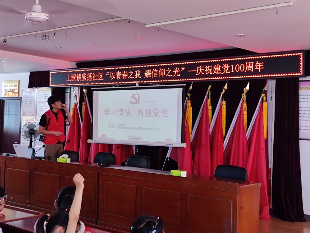 2021年7月15日,抱着认真学习党史,增进对党的情怀,安徽三联学院交通工程学院三下乡“暖行”实践团来到了肥西县紫蓬社区,以“精神维度把握党史学习,在传承红色基因中赓续共产党人精神血脉”的宗旨,在社区进行重温党史并铭记党史的红色精神宣传活动。