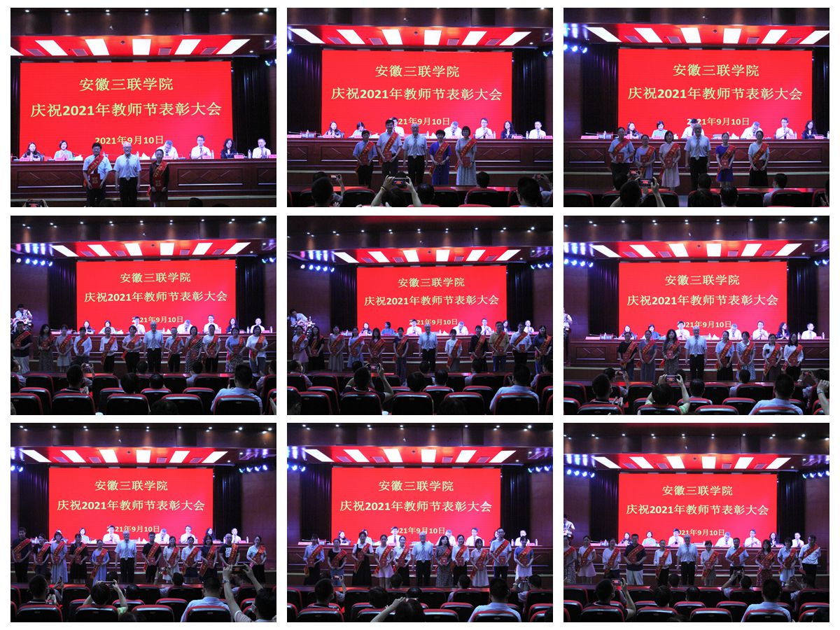 大会在庄严的国歌和校歌声中拉开序幕,副校长蔡文芬宣读表彰文件。大会表彰了安徽省教学名师、线上教学名师,省课程思政教学名师,省教坛新秀、线上教坛新秀,省示范基层教学组织,省高校图书馆2020年度青年优秀人才,2020年全国民办高校优秀辅导员,首届安徽省高校教师教学创新大赛暨全国选拔赛获奖教师团队,第二届长三角民办高校教师教学技能大赛获奖者;安徽三联学院2020年度优秀教师、第十六届青年教师教学基本功大赛获奖教师及2019-2020学年优秀教研室,共计72人次。金会庆校长为获奖教师颁发荣誉证书并合影留念。
