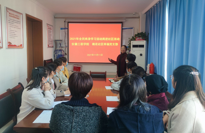 为深入贯彻落实党的十九大和十九届二中、三中、四中、五中全会精神,全面贯彻落实习近平总书记关于教育的重要论述,推动实现“构建服务全民终身学习的教育体系”“建设学习型社会”目标,根据《教育部办公厅关于举办2021年全民终身学习活动周的通知》(教职成厅函〔2021〕20号)和《安徽省教育厅关于举办2021年安徽省全民终身学习活动周的通知》(皖教秘职成〔2021〕45号)精神,我校继续教育学院开展2021年全民终身学习活动周进社区活动,本次活动主题为“庆建党百年华诞 谱终身学习新篇”。