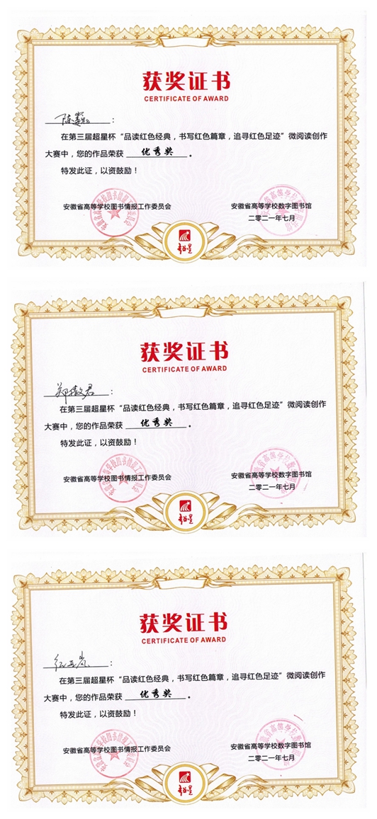 为庆祝党的百年华诞,进一步牢记党的宗旨,坚定理想信念,让思想政治工作融入阅读推广实践中,由安徽省高等学校图书情报工作委员会、安徽省高等学校数字图书馆联合开展的第三届超星杯微阅读创作大赛圆满结束,我校学子在“书写红色篇章”征文活动中取得优异成绩。