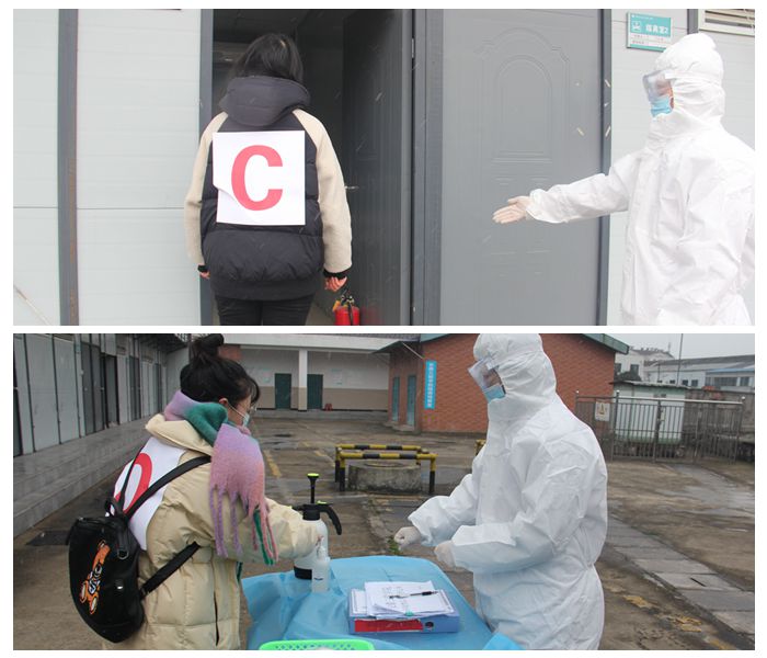 学生体温经检测后发现异常,体温超过37.3℃,迅速启动应急处理流程,现场联络员引导学生到复测点,医务人员用水银温度计复查腋下体温(两次)。测温期间,医务人员询问该同学姓名、学院、辅导员、有无不适症状、详细询问并登记其流行病学史。若体温均超出正常值,则原地等候,由校医院安排医务人员和专用送诊车辆护送学生至安徽医科大学第二附属医院。发热学生离开后,由专人对临时等候区域进行消毒。