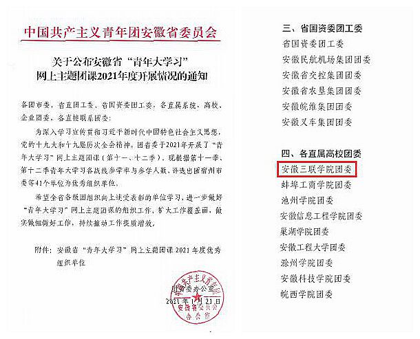 近日,团省委公布了安徽省“青年大学习”网上主题团课2021年度开展情况,我校团委荣获安徽省“青年大学习”网上主题团课2021年度优秀组织单位。