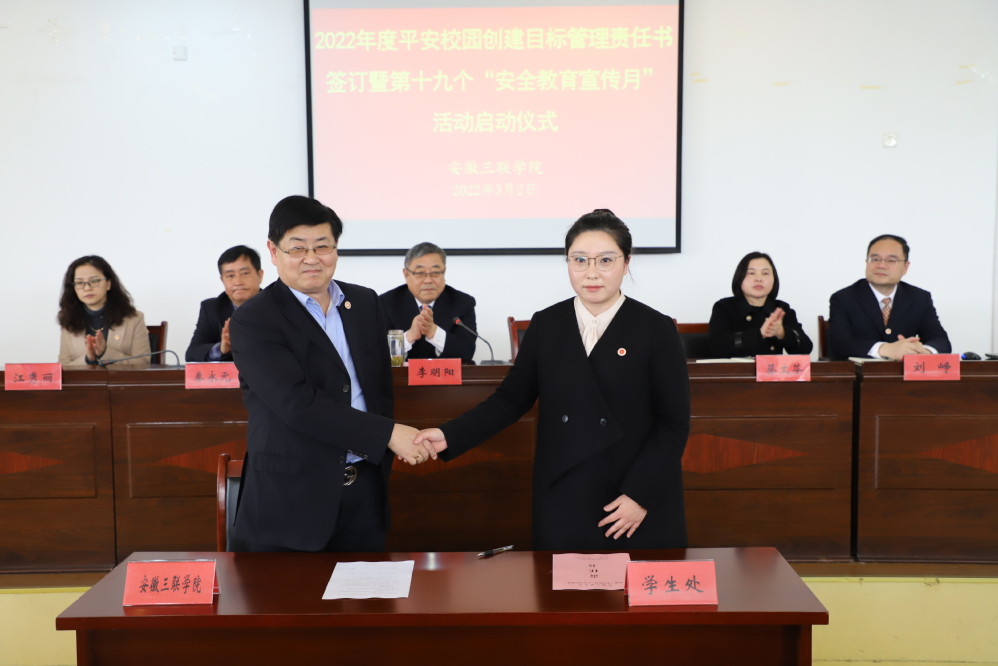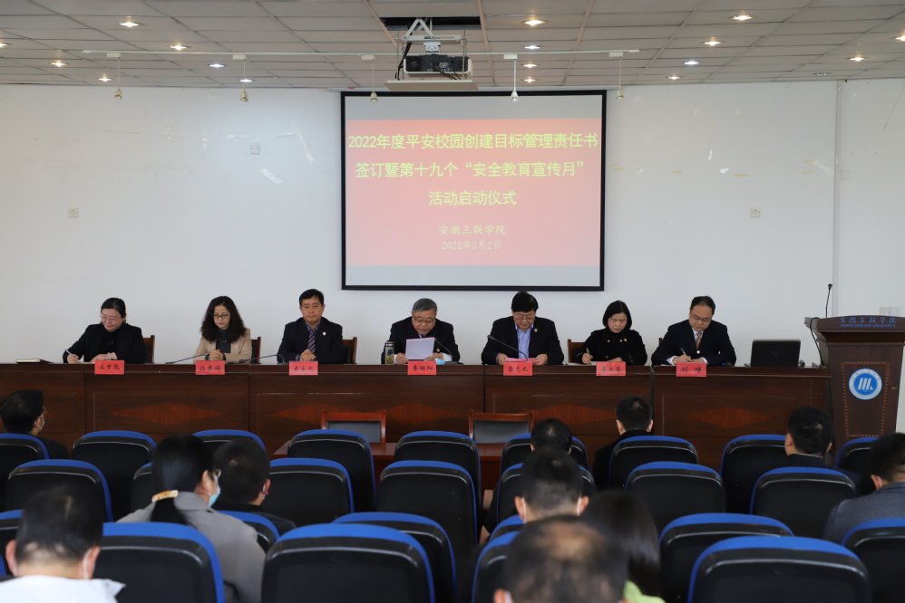宋梦岚首先宣读《安徽三联学院第十九个“安全教育宣传月”活动方案》,明确了活动内容和具体措施。各二级学院执行院长、职能部门代表学生处、总务处、保卫处、实验室与设备管理处主要负责人分别与学校签订平安校园创建目标管理责任书。