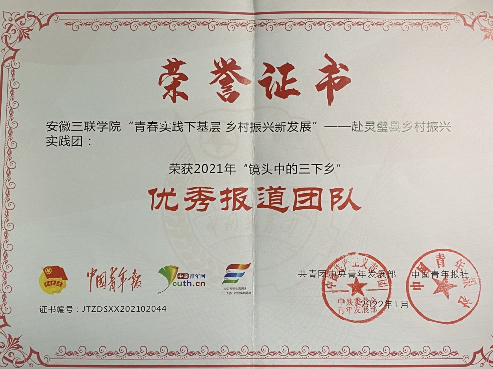由团中央青年发展部、中国青年报、中国青年网联合下发的《2021年全国大中专学生志愿者暑期“三下乡”社会实践“镜头中的三下乡”活动遴选结果公示》中,我校“青春实践下基层 乡村振兴新发展”——赴灵璧县乡村振兴实践团荣获“优秀报道团队”荣誉称号。
