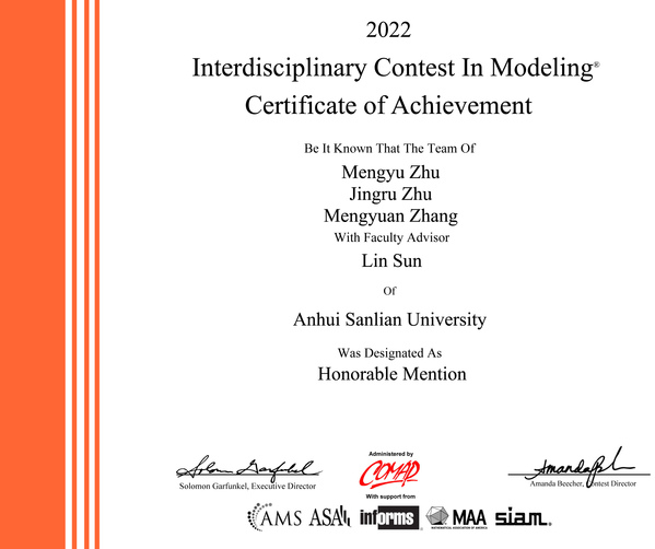 近日,2022年美国大学生数学建模竞赛成绩揭晓,我校交通工程学院学生朱梦雨、朱静茹,经济管理学院学生张梦圆荣获国际二等奖,这是我校学子继2021年全国大学生数学建模竞赛及亚太地区大学生数学建模竞赛获奖后,再次在国际高水平大赛中荣获佳绩。