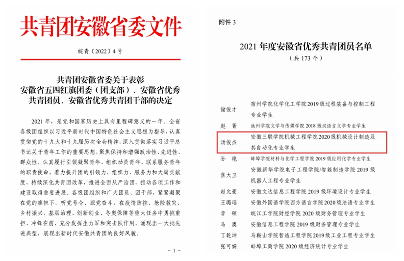 近日,共青团安徽省委员会公布2021年度全省“两红两优”表彰决定,机械工程学院2020级机械设计制造及其自动化专业(1)班汤俊杰同学荣获2021年度“安徽省优秀共青团员”称号。