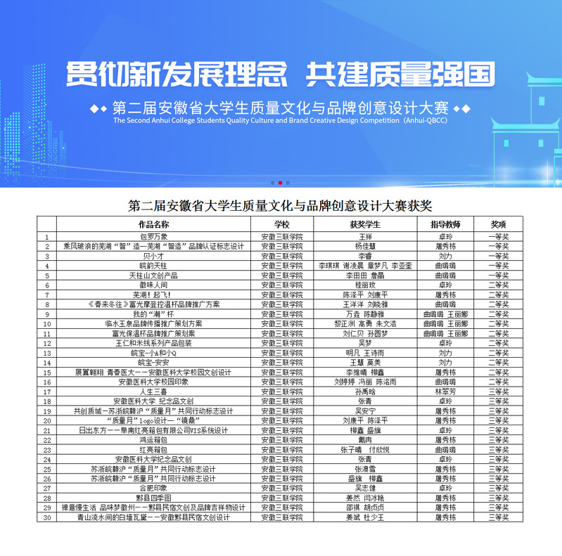 近日,安徽省教育厅公布了第二届安徽省大学生质量文化与品牌创意设计大赛获奖名单,我校动漫与数字艺术学院学生作品从数万件参赛作品中脱颖而出,获得一等奖5项、二等奖11项、三等奖14项。