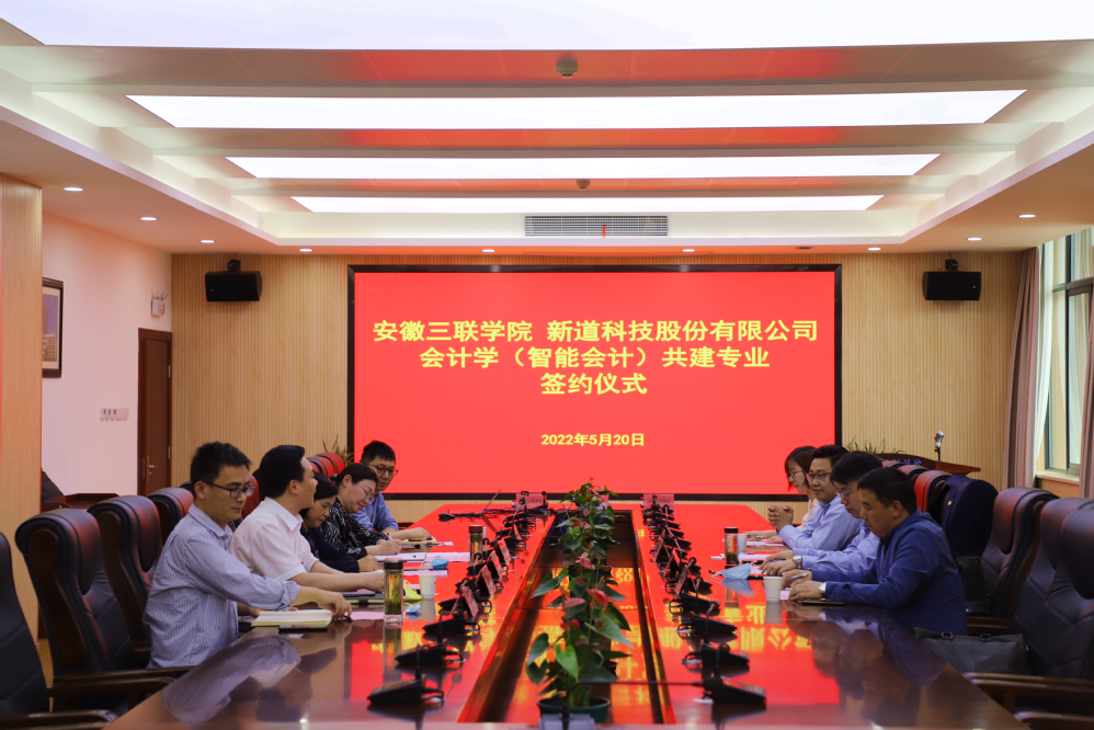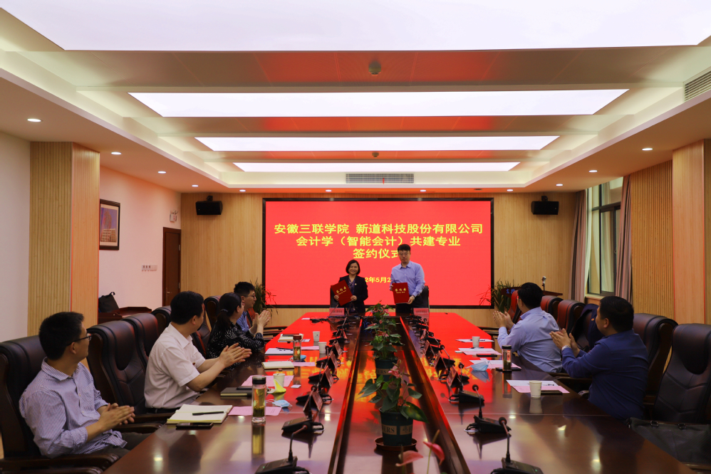 学校与新道科技股份有限公司成功签约,合作共建智能会计专业,是双方顺应国家和学校产教融合发展战略,立足前期双方合作基础,进一步深化产教融合校企合作的重要举措,有利于双方共享共建优质教学资源,深化教育教学改革,强化专业内涵建设,凝练办学特色,培育优秀人才,形成产教融合、双元育人的良性生态。(撰稿:夏玉洁 摄影:王卉 编辑:刘欢)