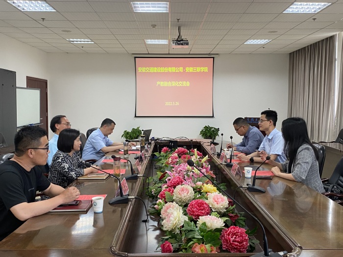 5月26日下午,安徽交通建设股份有限公司副总工程师宣菲、人力资源总经理吴海燕、人事经理沈艳军至我校交流产教融合事宜,我校副校长张世伟、蔡文芬及交通工程学院领导参加研讨会。