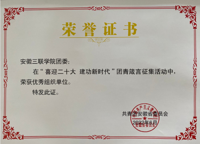 近日,团省委“喜迎二十大 建功新时代”团青箴言征集活动结果公布,学校团委荣获“优秀组织单位”。