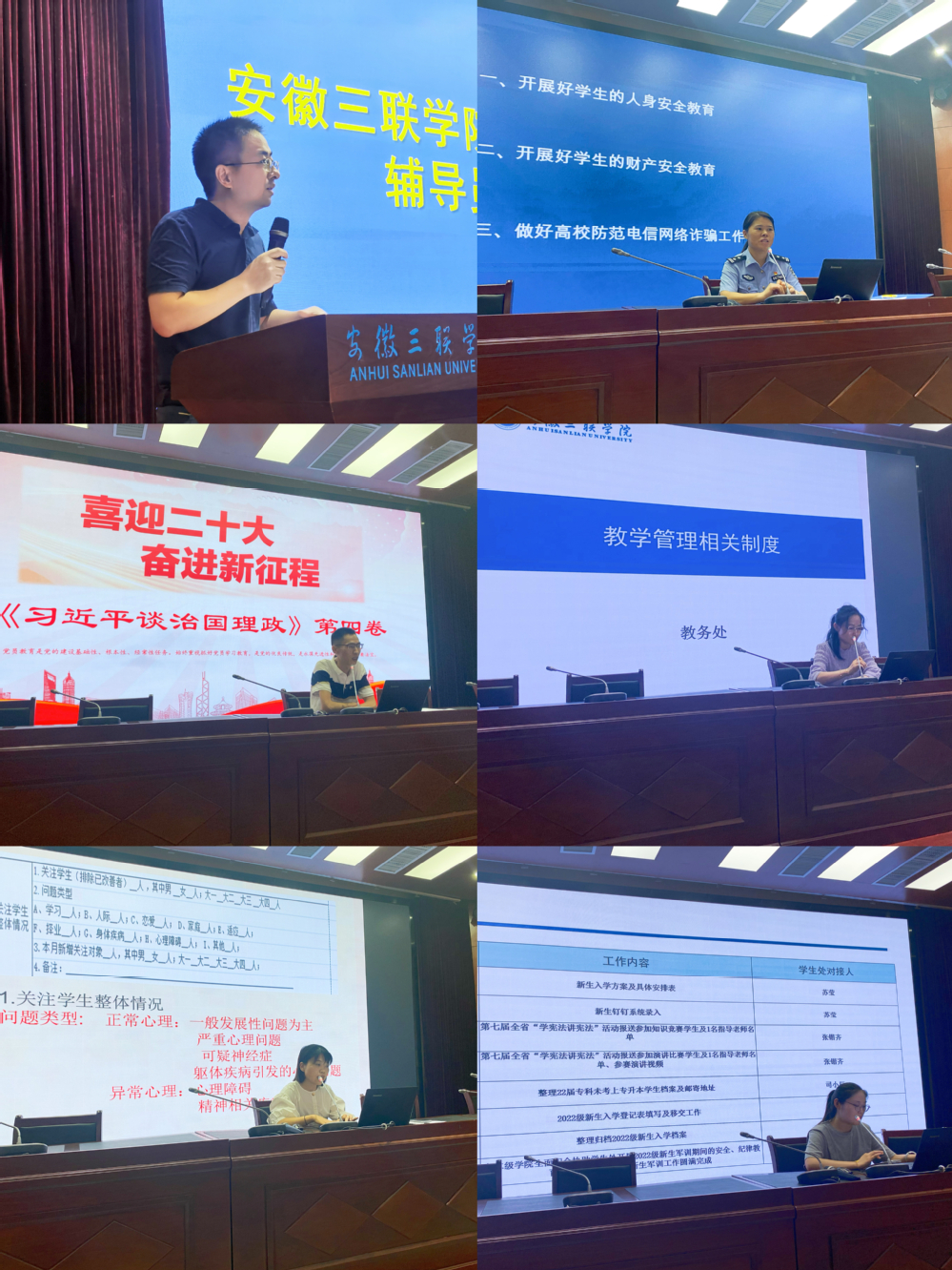 培训会上,郭庆芳警官结合工作实际,通过讲法律、谈案情、举案例等方法,围绕目前大学校园里容易产生的寻衅滋事、打架斗殴、盗窃、网络诈骗、情感、疫情防控等一系列热点问题进行了讲解,进一步增强师生的安全防范意识;党委办公室张启元副主任带领全体辅导员集中学习《习近平谈治国理政》第四卷,通过学原文、悟原理、知原义,把这本著作的核心要义和辅导员工作结合起来,立足岗位传承红色基因,以实际行动迎接党的二十大胜利召开;教务处副处长张薇围绕培养计划与教学组织、创新创业与社会责任教育、辅修专业及辅修学士学位、学籍管理、学位授予五个方面作了教学管理相关制度的专题报告;心理咨询中心刘青霞老师通过“大学生常见心理问题”“大学生心理危机预防应对”“心理月报表”等内容的讲解,从日常沟通、发现识别以及如何有效应对学生危机事件等方面向辅导员老师们传授了相关知识与方法;学生处苏莹老师就开学初各项学生管理工作完成时间点及对接人进行详细介绍。