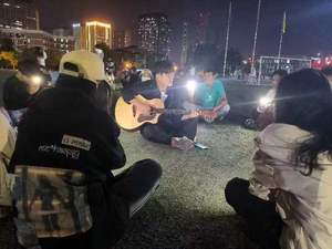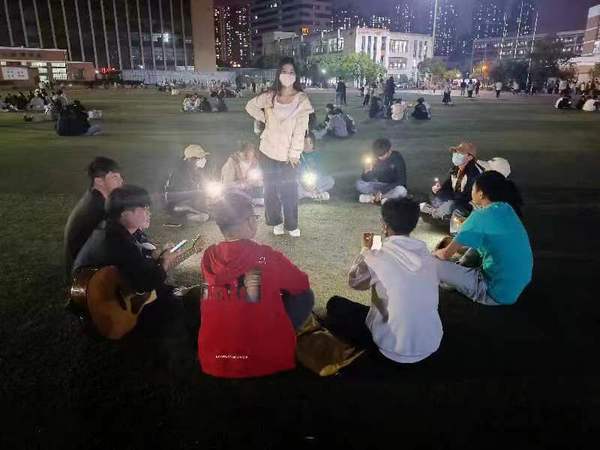 傍晚夜色降临,我院在操场中央组织“草地音乐节”活动。以草地为席,以星空为幕,在音乐声中展现青春风采。同学们围坐一圈,在掌声和欢呼声中,伴随着温柔的吉他声,大家开始轻声唱和,跟着节奏一起舞动。挥舞着的手机灯光仿佛繁星点点,伴随着音符的跃动还有优雅的古典舞。大家沉浸在音乐的海洋和欢声笑语中。