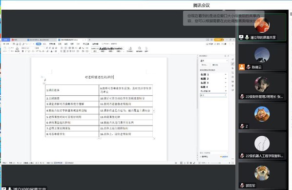 10月28日晚7点,本着了解学生线上学习效果,助力线上教学的目的,基础部针对2021、2022两个年级学生,利用腾讯会议召开线上座谈会,10个学院的近百名学生参加了座谈会。为确保尽可能地解答学生的疑问并收集学生的真实想法,基础部精心设计了《2022-2023学年第一学期教学效果调查问卷》和《教师授课效果描述性评价指标》。学生代表踊跃发言,对线上教学的好做法表示认同,比如教师的PPT做的非常用心、老师课间和学生的共情、老师的线上教学技巧和质量明显提升等等,根据收回的3308份问卷和部分学生代表线上座谈所反馈的问题,与会教师在线一一解答,为学生提出解决问题的良策,师生沟通有温情有引领。