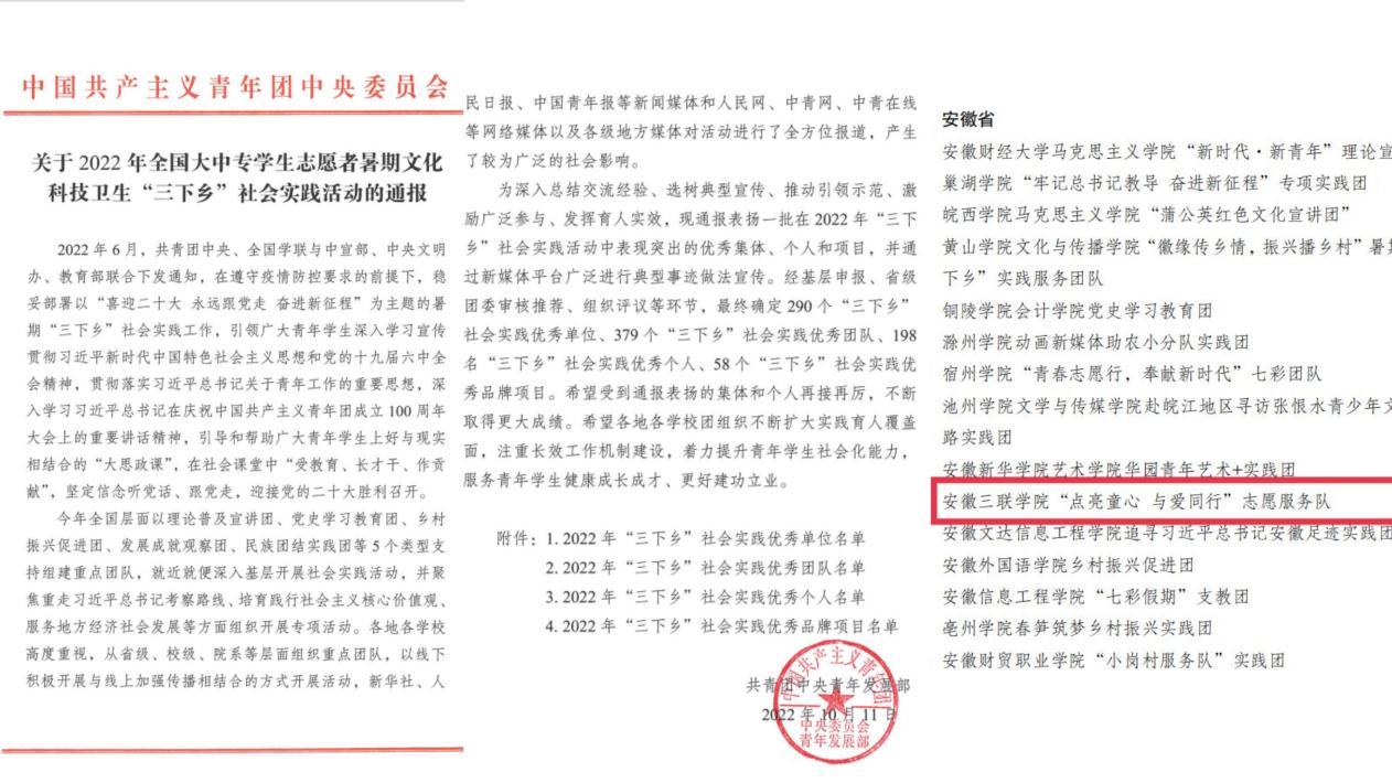 近日, 2022年全国大中专学生志愿者暑期“三下乡”社会实践活动圆满落下帷幕,我校“点亮童心,与爱同行”志愿服务队荣获2022年全国大中专学生志愿者暑期“三下乡”社会实践活动优秀团队,这是本团队继获得“七彩假期”全国示范团队后,又一次获得国家级殊荣。