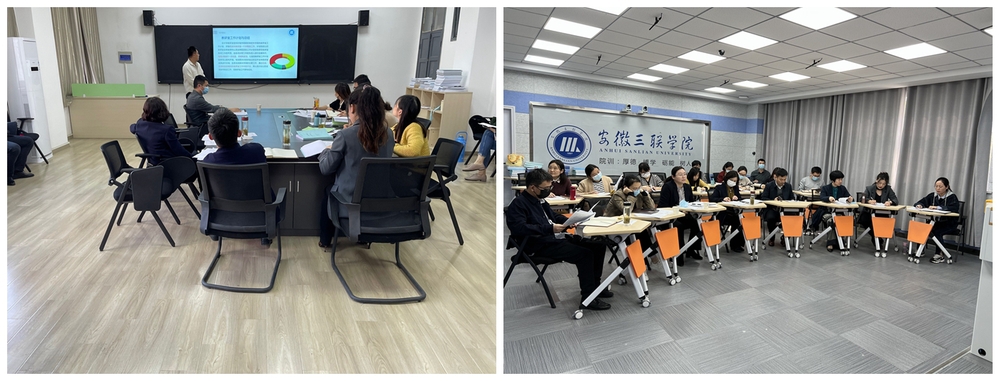 分组评审阶段采用人文艺术、理工类交叉互评互促方式同时进行。各教研室主任依次汇报了2021-2022学年教研室工作总结、存在问题及工作展望。评审委员根据《安徽省普通高校基层教学组织(教研室)标准化建设和示范标准(试行)》《安徽三联学院教研室工作考评指标体系》,结合听取汇报及查阅相关支撑材料,从组织建设、教学管理、教学建设、教学改革、科学研究等五个方面进行全面评价,并指出改进建议。宋梦岚在分组评议过程中建议各教研室要进一步凝练成果,加强经验总结,突出亮点特色;要“不忘初心”,秉持以生为本理念,以人才培养质量提升为目标,体现学生培养成效。