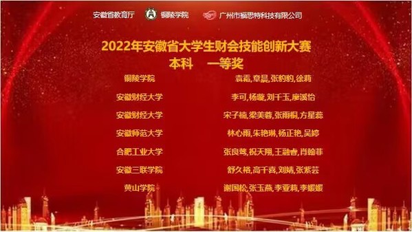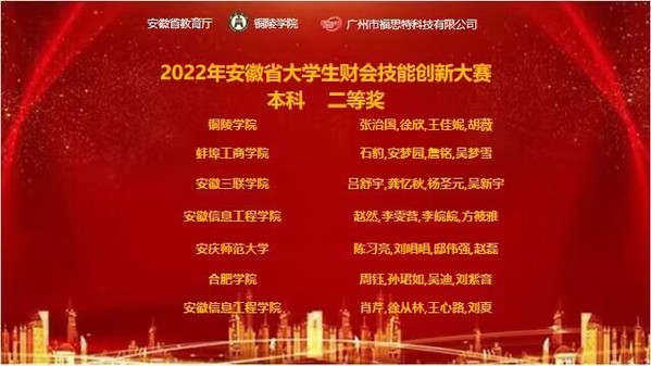 11月26日,由安徽省教育厅主办、铜陵学院承办,羚羊工业互联网平台提供技术支持的2022年安徽省大学生财会技能创新大赛圆满落幕。来自合肥工业大学、安徽财经大学、铜陵学院等31所学校64支队伍积极参赛,我校财会学院参赛的两支队伍分别获得一等奖和二等奖。