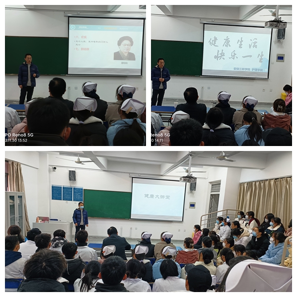 11月30日下午,护理学院在护理楼406教室开展首次“卫生健康宣传月”宣讲活动“健康大讲堂”。校党委副书记、副校长鲁先长、护理学院执行院长兰先兰、学管副院长赵利侠出席活动,护理学院科研副院长胡建国担任主讲教师,教师代表及百余名学生参加学习。