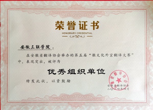 4月20日,由安徽省翻译协会主办,淮南市人民政府外事办公室、淮南师范学院承办的“淮河能源杯”安徽省第五届徽文化外宣翻译大赛颁奖活动顺利举行。安徽三联学院获得优秀组织单位奖。