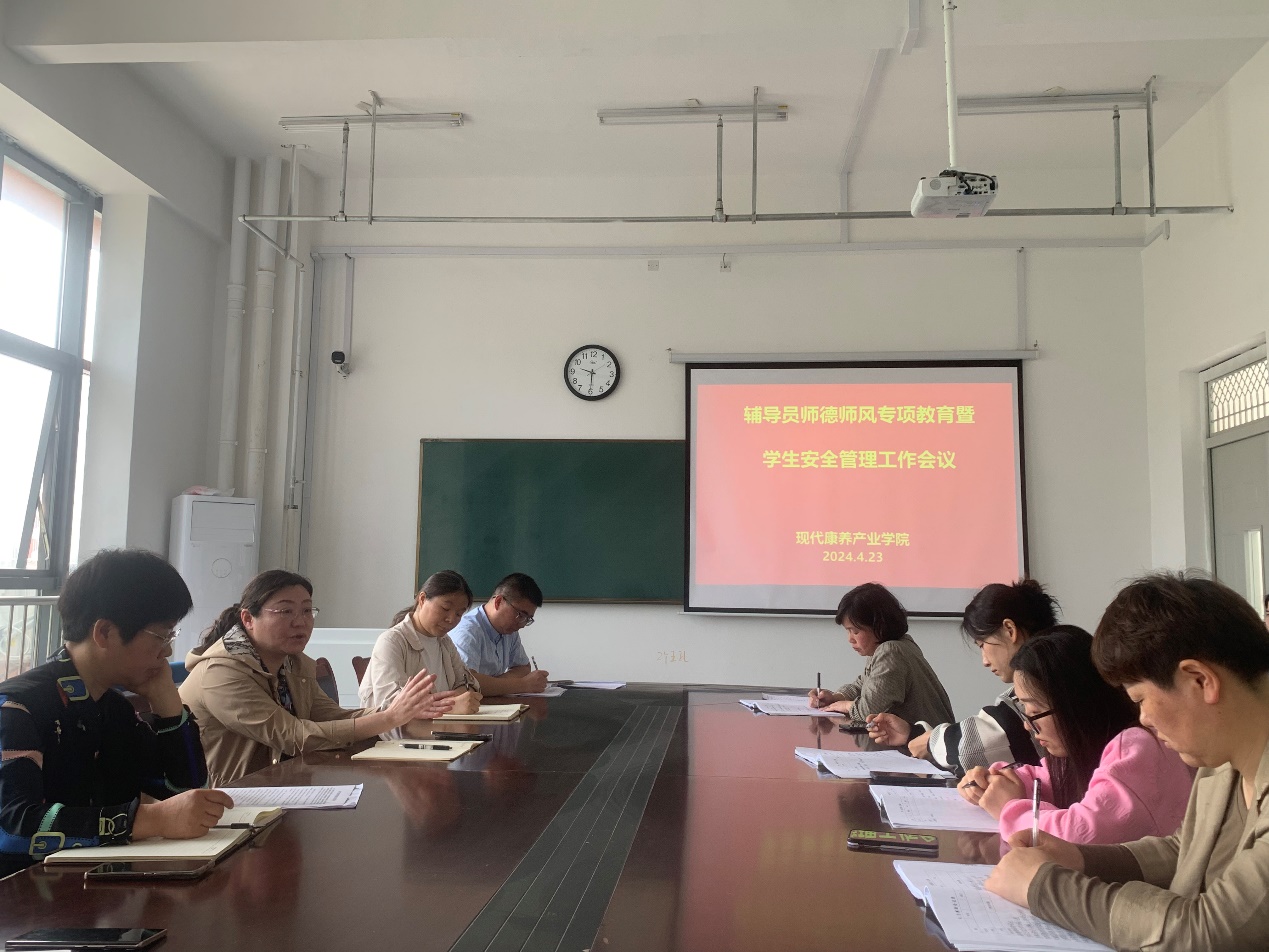 4月23日,现代康养产业学院在康养1号楼202会议室召开辅导员师德师风专项教育暨学生安全管理工作会”。校党委委员、副校长、产业学院院长宋梦岚等班子成员以及全体辅导员参加会议。