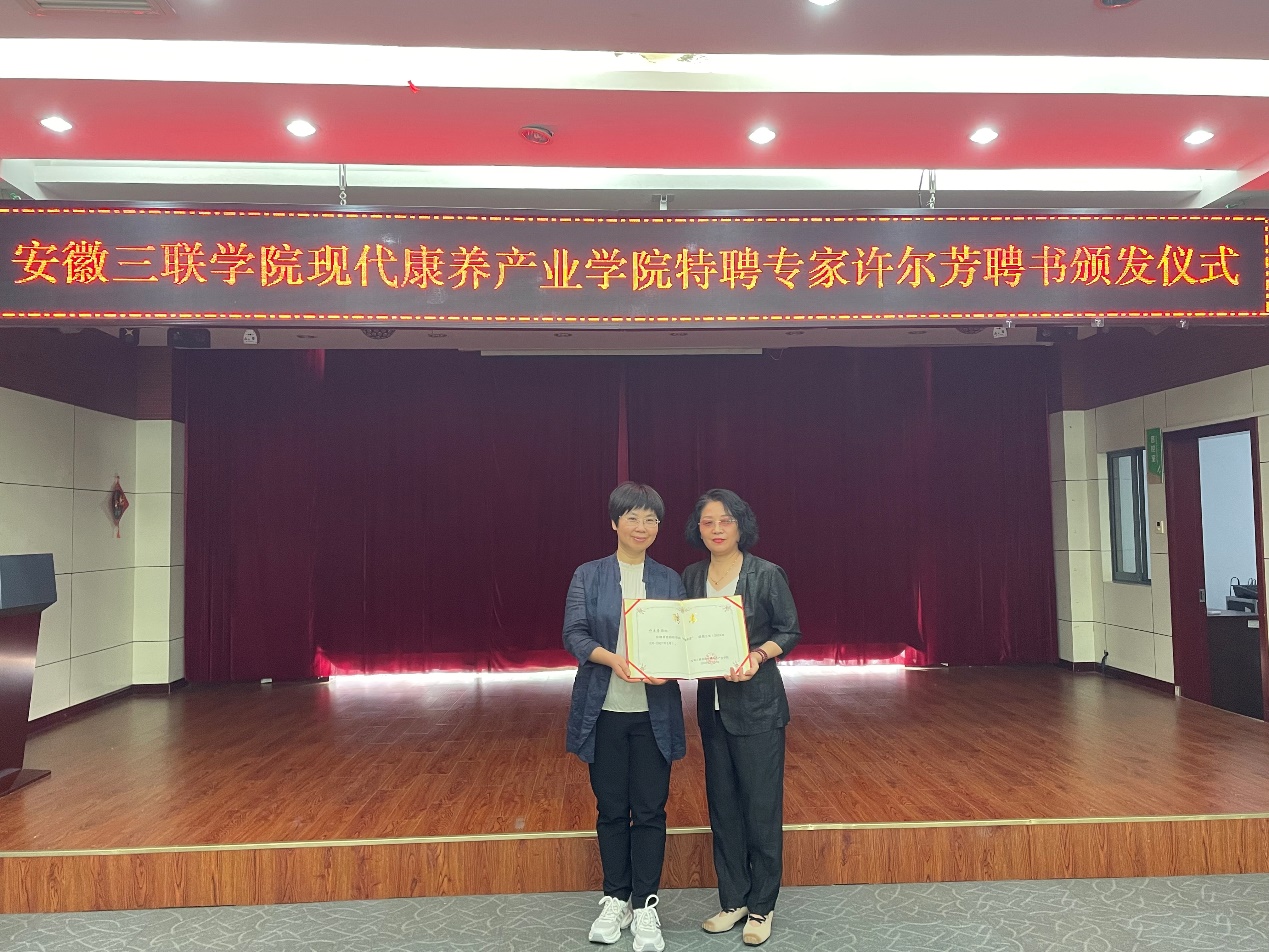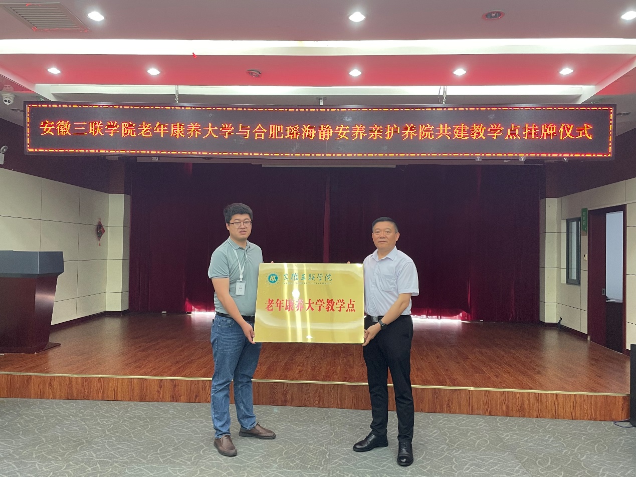 安徽三联学院学生实践教学基地在护养院挂牌,李蓉晖为许尔芳颁发特聘专家聘书;双方领导为安徽三联学院老年康养大学与护养院共建教学点揭牌。