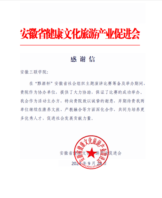 近日,安徽省健康文化旅游产业促进会向我校发来感谢信,感谢安徽三联学院在“黟酒杯”第三届安徽省社会组织“奋进新时代 强国我先行”主题演讲比赛筹备及举办期间提供的大力协助,保障比赛成功举办。
