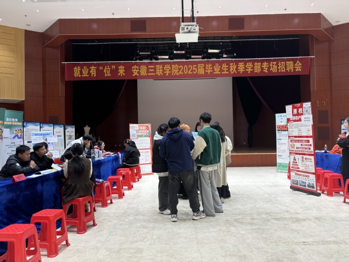 11月20日下午,学校在图书馆一楼多功能厅举办就业有“位”来·安徽三联学院2025届秋季学部专场招聘会。活动邀请新华人寿保险股份有限公司、合肥铁榔头教育科技有限公司、人本股份有限公司等20家优质企业,主要面向新商科学部、文学部毕业班学生,为毕业生提供涵盖市场营销、财务管理、教育培训等多个领域的职业选择空间,提供对口职位600余个,吸引500余名毕业班学生到场参会。