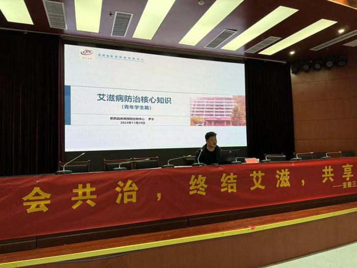 11月29日下午,我校举行“社会共治,终结艾滋,共享健康”主题校园活动。肥西县疾控中心科长罗宇、肥西县疾控中心党支部相关人员和肥西县公安局禁毒社专家,校财务总监范兆红、校医院相关工作人员及学生代表近300人参加活动。