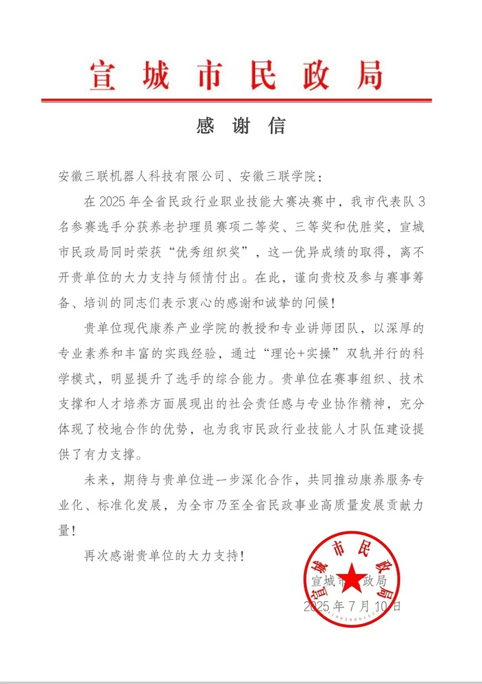感谢信中特别指出,安徽三联学院团队凭借扎实的学术功底和丰富的实践经验,为宣城市民政行业的技能人才队伍建设提供了强有力支持。此次合作不仅展现了高校服务地方经济社会发展的责任担当,也为持续推进校地合作奠定了良好基础。(撰稿、摄影:黄琴 编辑:任玥)