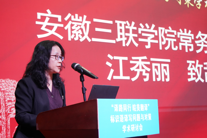 常务副校长、安徽省翻译协会副会长江秀丽致欢迎辞。她指出,作为安徽省首所民办高校,安徽三联学院近三十年的应用型人才培养的积淀与“产学研一体化”的办学特色,为本次研讨会的顺利举办奠定了坚实基础。江秀丽强调,“译路同行 皖美翻译”是翻译界的共同愿景,学校期待与专家学者、兄弟院校及业界同仁深化合作,为安徽翻译事业贡献“三联力量”。