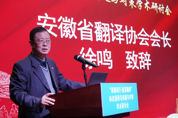 安徽省翻译协会会长徐鸣代表主办方致辞,他对我校精心筹备本次会议表示感谢,并强调了全球化背景下规范公共标识语翻译的重要性。他还特别介绍了由我校牵头承担的《安徽省城市公共标识语汉英翻译规范实践研究》项目已取得阶段性成果。