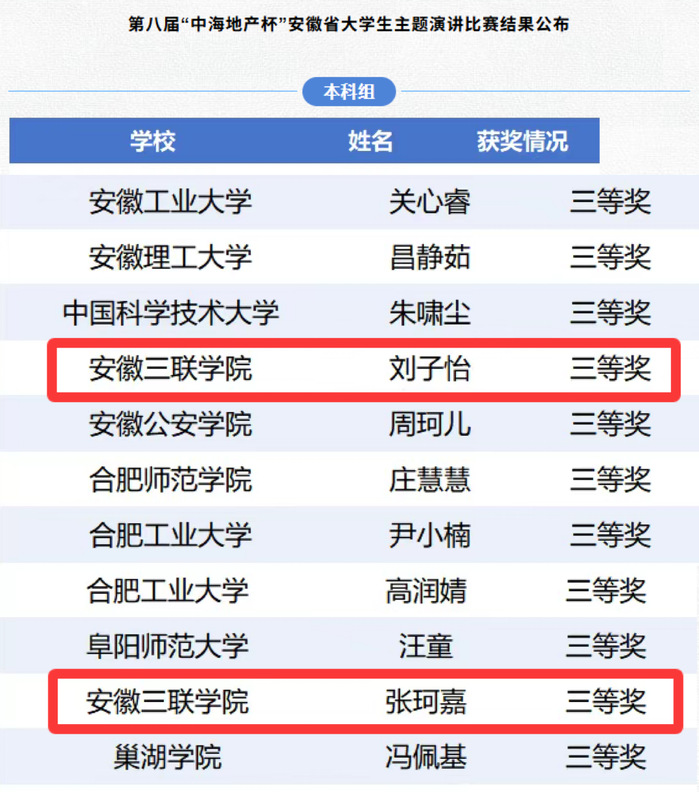 近日,由共青团安徽省委员会、安徽省教育厅、安徽省学生联合会共同主办的第八届“中海地产杯”安徽省大学生主题演讲比赛顺利落幕。我校两名学子在全省 294 名参赛选手中脱颖而出,均荣获本科组三等奖。